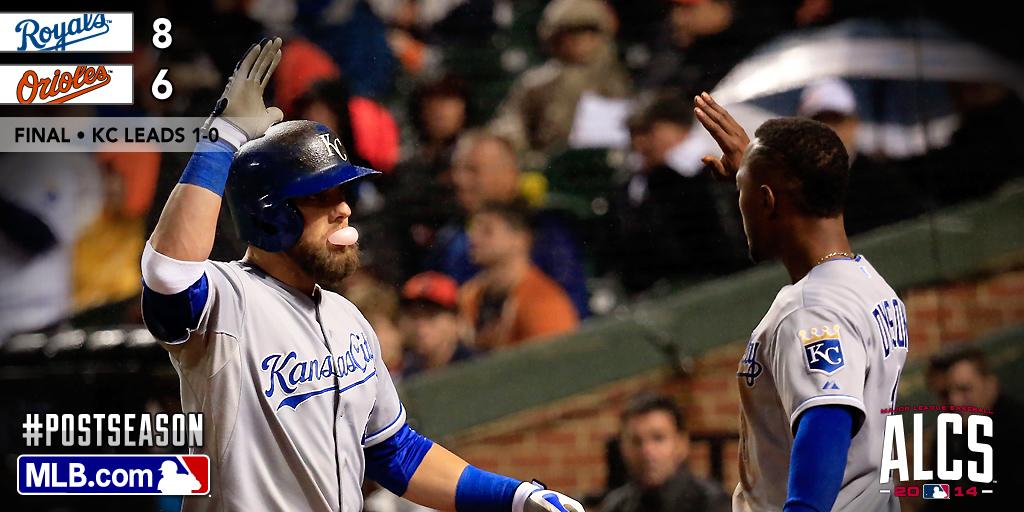 Luego de que los Orioles dejaran la casa llena en la segunda entrada, el venezolano Alcides Escobar conectó un lanzamiento en cuenta de 2-0 de Chris Tillman por encima de la barda de jardín izquierdo para romper la igualada a cero. Fue apenas su jonrón 22 en 2,994 turnos en su carrera, incluyendo esta postemporada.
